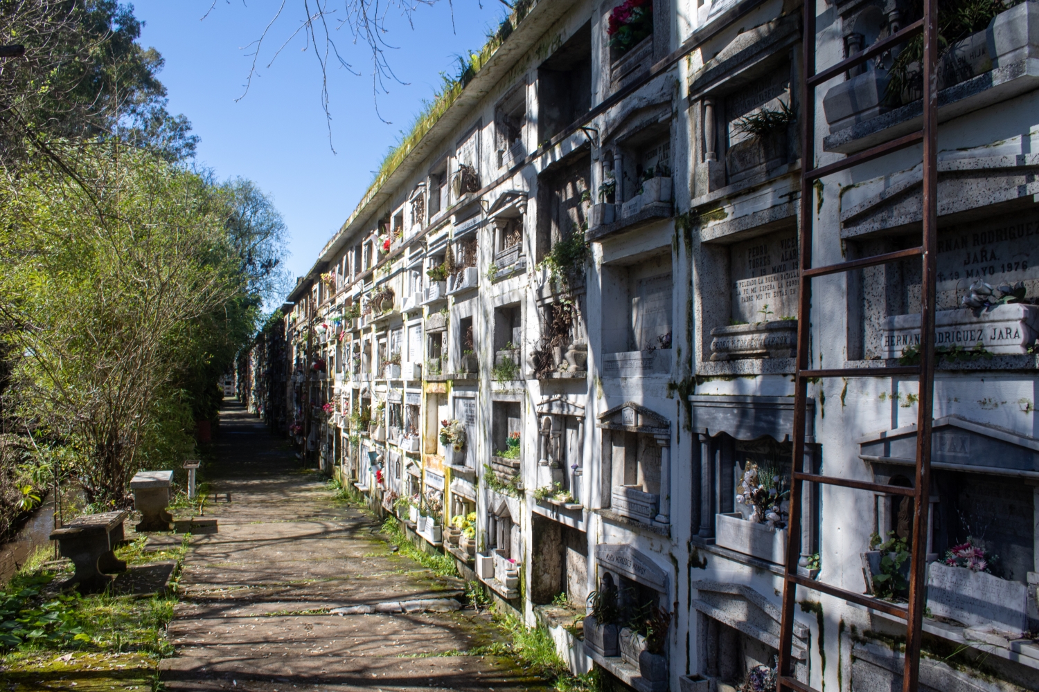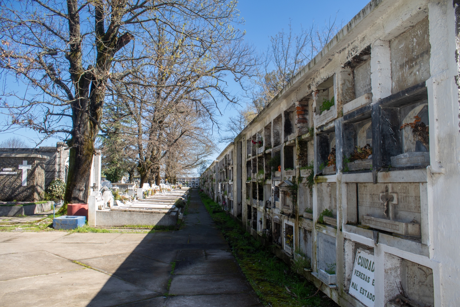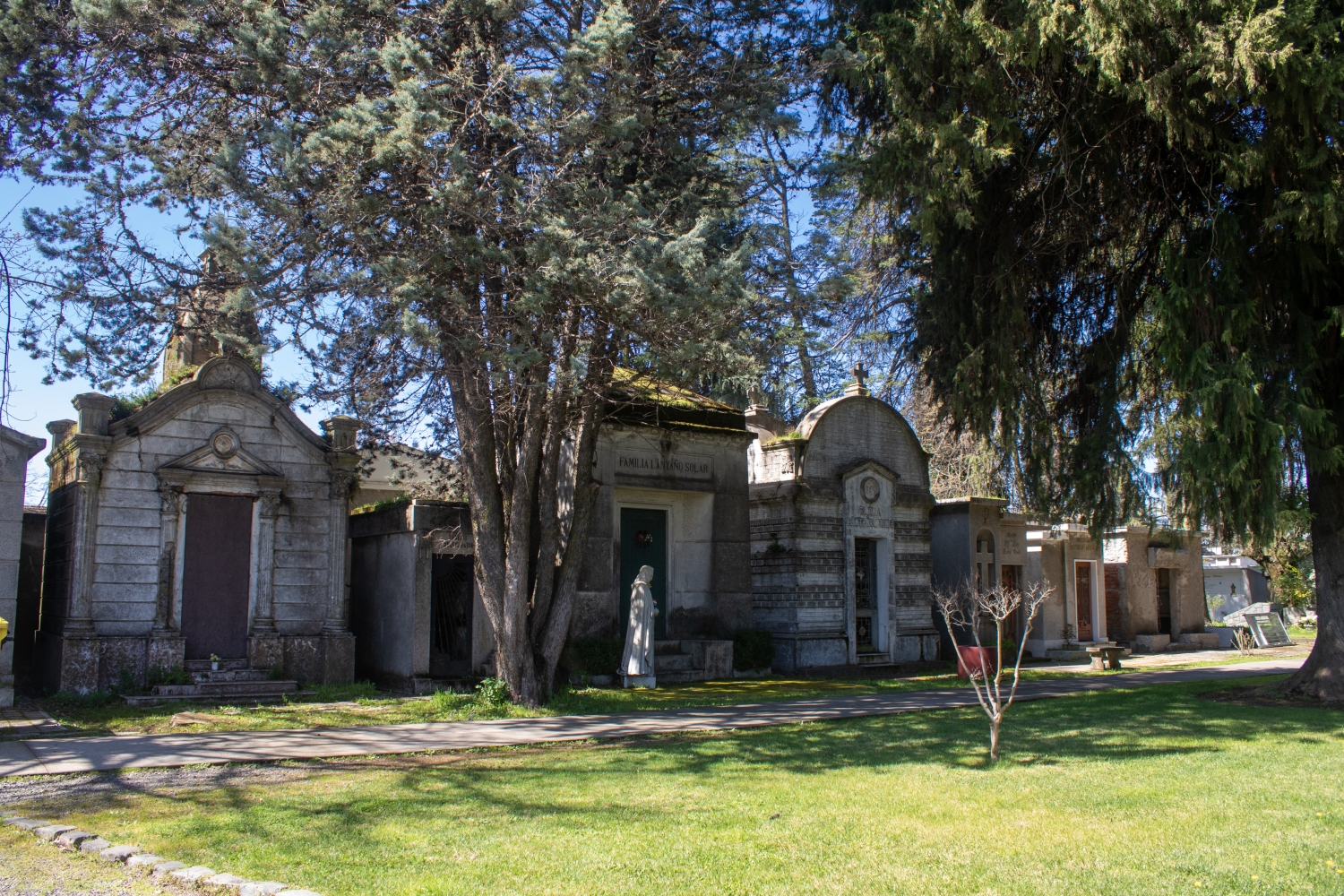 In its interior, the gray and white colors of the tombs, niches, mausoleums, and marble sculptures that can be found around the corridors and vegetation areas are remarkably predominant. Some of the trees that can be observed in the enclosure are pines, oaks, lindens, firs, palms, araucarias, and cypresses, among others.